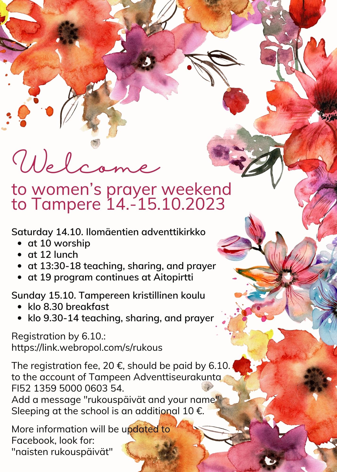 Tervetuloa mukaan naisten rukousviikonloppuun Tampereelle. Voit odottaa oivaltavia alustuksia, luovia harjoituksia, hoitavaa esirukousta ja lämmintä yhteyttä naisten kesken.